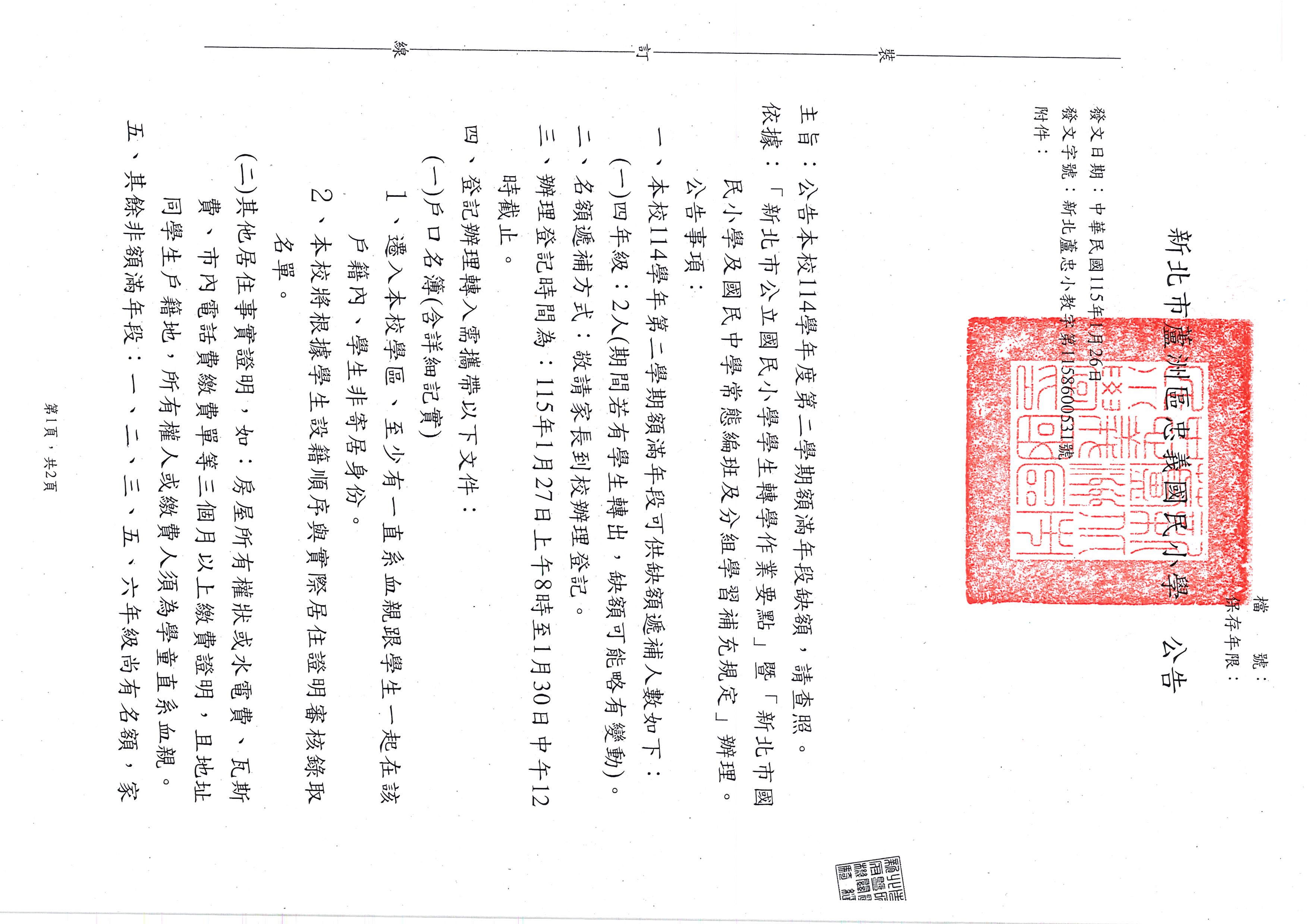 公告114學年度第二學期額滿年段缺額